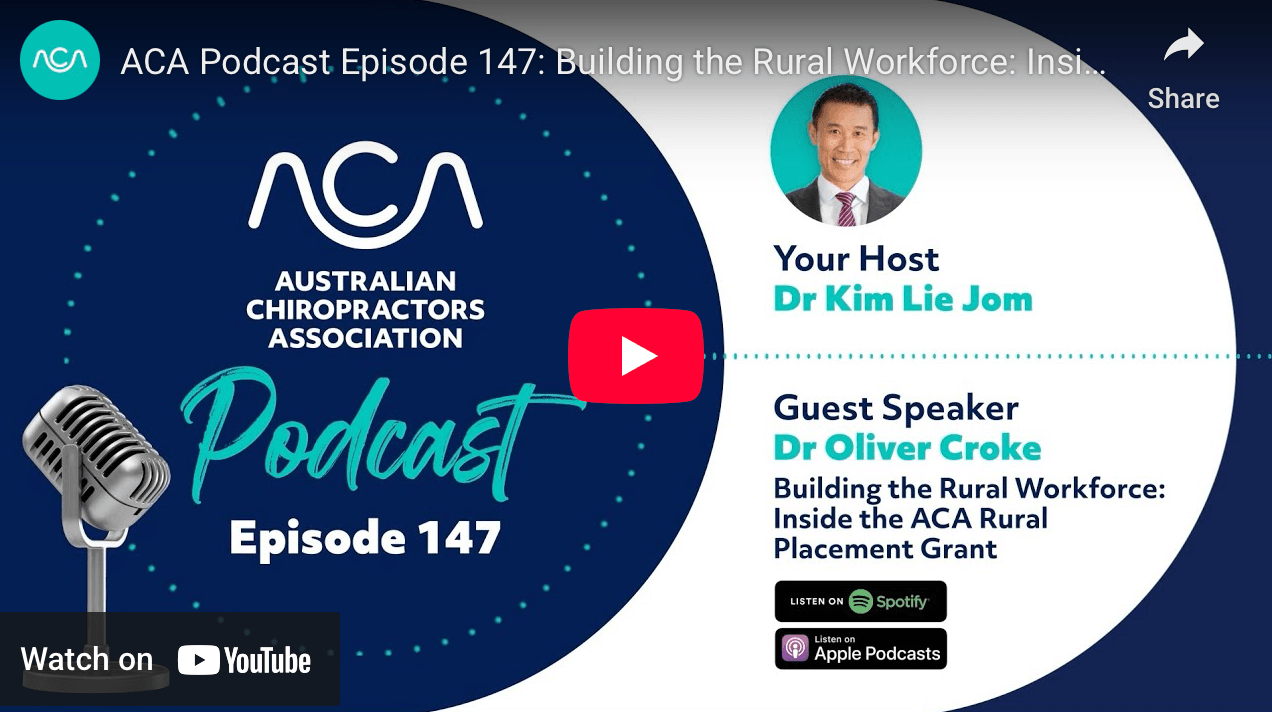 Hosted by Dr Kim Lie Jom, Episode 147 with Dr Oliver Croke, chiropractor and ARRPN Committee Member, about the ACA’s Rural Placement Grant. This is an exciting initiative he helped establish to encourage chiropractic students to undertake clinical placements in regional, rural and remote communities. The Grant also aims to support rural practitioners by helping them attract future associates, grow their practices and improve access to chiropractic care.