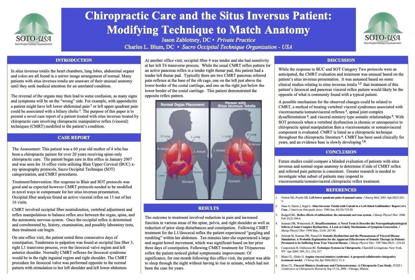 Cite: Zablotney J, Blum C. Chiropractic care and the Situs Inversus patient: Modifying technique to match anatomy [Abstract only]. Asia-Pac Chiropr J. 2022;2.4:Online only. URL apcj.net/Abstracts/#Zablotney