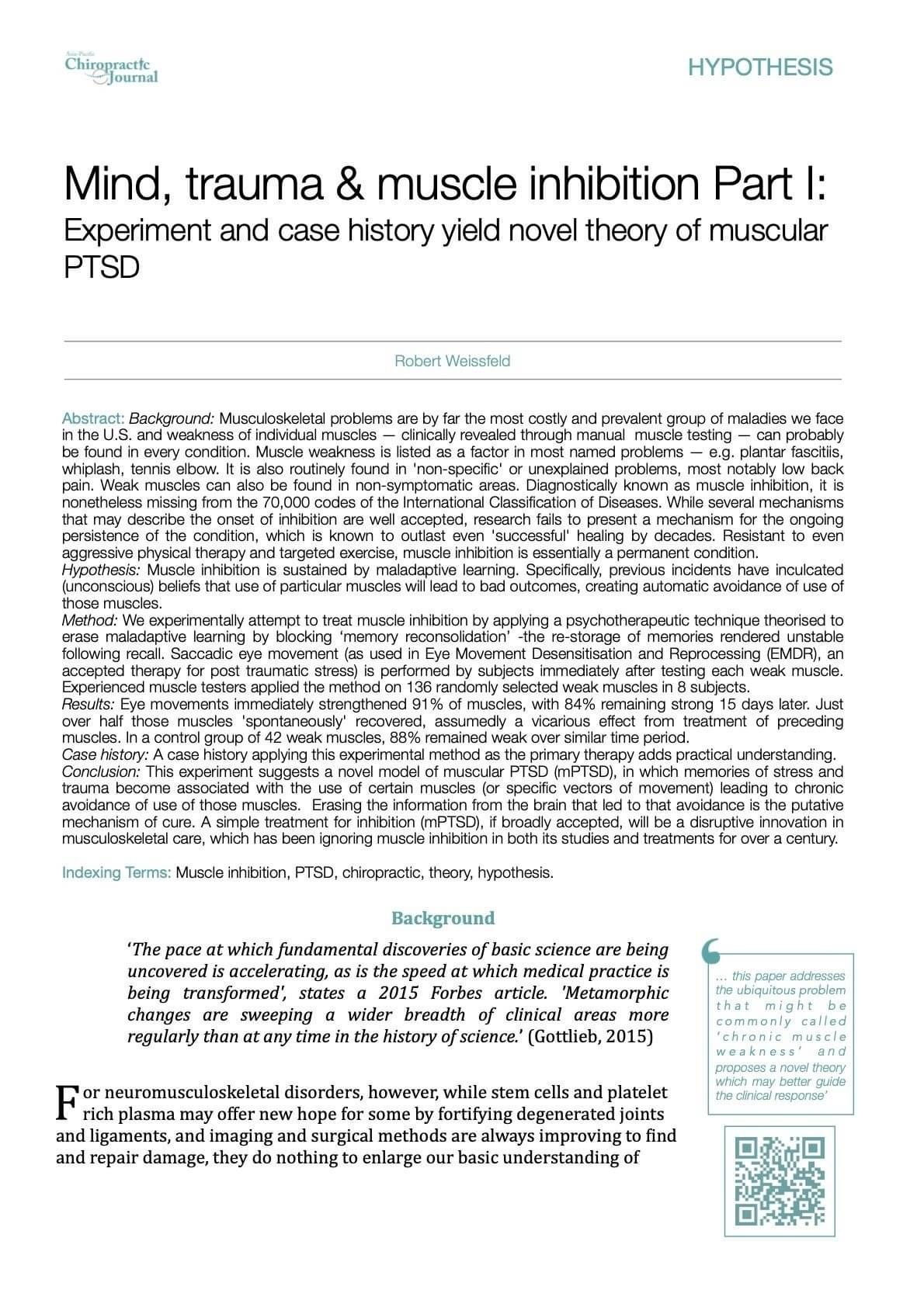 Weissfeld R. Mind, trauma & muscle inhibition Part I: Experiment and case history yield novel theory of muscular PTSD [Hypothesis].