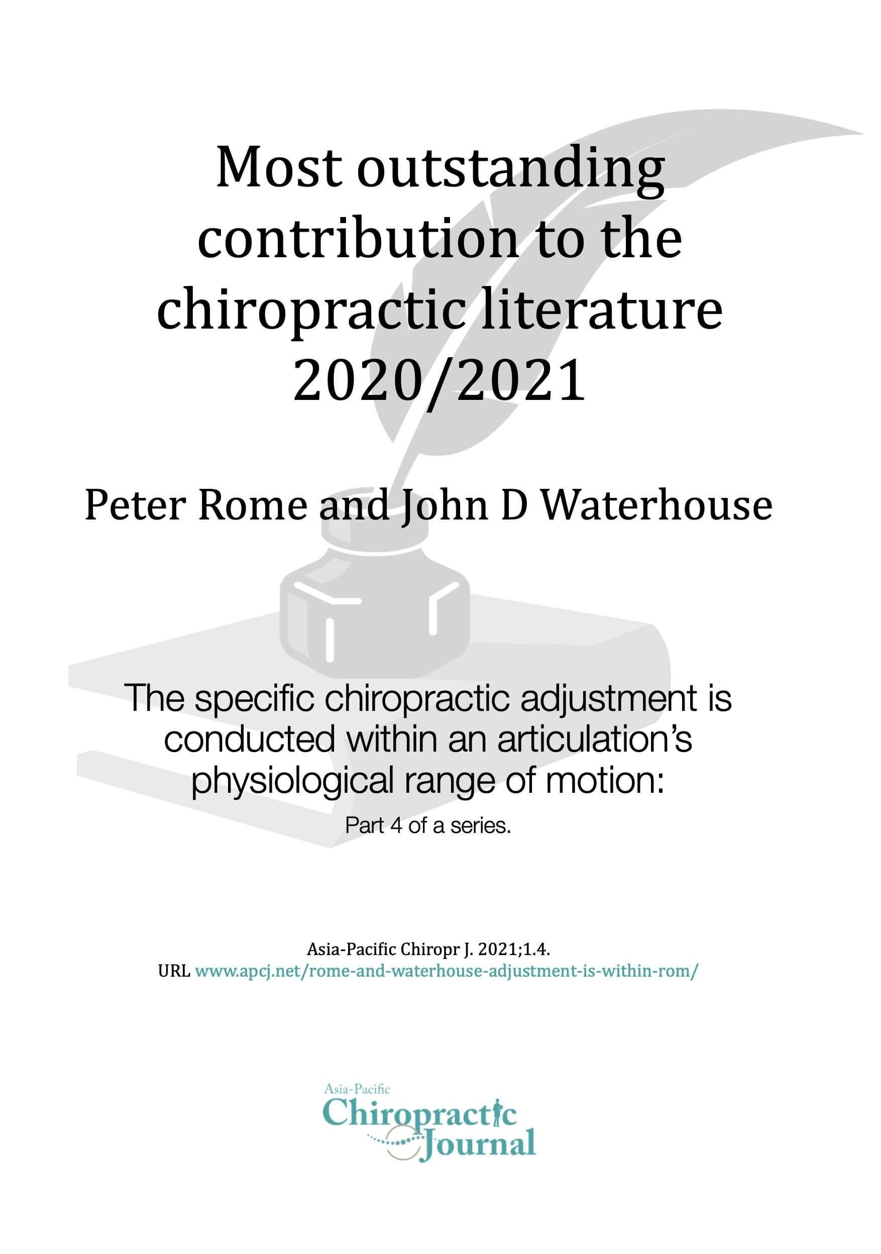 The Most Outstanding Contribution to the chiropractic literature is a marvellous explanation by Rome and Waterhouse on the mechanisms of the adjustment, putting paid to the myth that the therapeutic thrust by a trained chiropractor takes the spinal joint beyond beyond its normal physiological range of motion. Clearly, it does not, and this paper will come to be cited in future legal cases. This is now the second indexed paper making this critically important point. We expect law-makers to now amend their statements to reflect the literature and ensure they have legal standing.